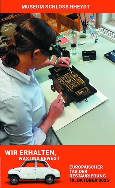 Veranstaltungsübersicht 109 Veranstaltungen gefunden. Veranstaltungen Suche und Ansichten, Navigation Suche Bitte Schlüsselwort eingeben. Suche nach Veranstaltungen Schlüsselwort. Suche Veranstaltungen Veranstaltung Ansichten-Navigation Map Liste Map Summary Heute Anstehend Anstehend Select date. This Veranstaltung does not have a mappable address. View Veranstaltung Details Okt. 13 Featured 13. Oktober - 19. Oktober Woche der Restaurierung Online, Verband der Restauratoren Weberstr. 61, Bonn Virtual Veranstaltung Veranstaltung Details Get Directions Veranstaltung Details Get Directions Okt. 16 17:00 - 18:00 Gläser, die Geschichte erzählen Stadtgeschichtliches Museum der Hansestadt Wismar Schweinsbrücke 6/8, Wismar Veranstaltung Details Get Directions Veranstaltung Details Get Directions Okt. 18 10:30 - 20:30 Untersuchen – Forschen – Dokumentieren – Konservieren – Restaurieren Atelier Ralf Persaú Restaurator Konservierung, Restaurierung Blutenburgstraße 110, München Veranstaltung Details Get Directions Veranstaltung Details Get Directions Okt. 19 All Day Tag der Restaurierung Zentrale Restaurierungswerkstätten der Museen der Stadt Erfurt Hospitalplatz 15, Erfurt Veranstaltung Details Get Directions Veranstaltung Details Get Directions Okt. 19 All Day Tag der Restaurierung am Musikinstrumenten-Museum Musikinstrumenten-Museum Berlin Tiergartenstraße 1, Eingang Ben-Gurion-Straße, Berlin Veranstaltung Details Get Directions Veranstaltung Details Get Directions Okt. 19 All Day Wir erhalten, was uns bewegt Veste Coburg Kunstsammlungen der Veste Coburg, Coburg Veranstaltung Details Get Directions Veranstaltung Details Get Directions Okt. 19 All Day Konservierung und Musik verbinden – Ein Doppelvirginal von A. Ruckers Musikinstrumentenmuseum der Universität Leipzig - GRASSI Johannisplatz 5-11, Leipzig Veranstaltung Details Get Directions Veranstaltung Details Get Directions Okt. 19 All Day Der andere Blick – Wissenschaft und Restaurierung im Kulturerbe Neues Palais Am Neuen Palais, Potsdam Veranstaltung Details Get Directions Veranstaltung Details Get Directions Okt. 19 8:00 - 17:00 Ausstellungsgespräch in „Restaurierung im Dialog“ Humboldt Forum Schlossplatz, Berlin Veranstaltung Details Get Directions Veranstaltung Details Get Directions Okt. 19 9:00 - 13:00 Ausbildung zum/r Restaurator*in – Das Goering Institut stellt sich vor! Goering Institut e.V. Staatlich anerk. Fachakademie Giselastrasse 7, München Veranstaltung Details Get Directions Veranstaltung Details Get Directions Okt. 19 10:00 - 10:45 Blick hinter die Kulissen: Führungen durch die Restaurierungsateliers GRASSI Museum für Völkerkunde zu Leipizg Johannisplatz 5-11, Leipzig Veranstaltung Details Get Directions Veranstaltung Details Get Directions Okt. 19 10:00 - 11:00 Öffentliche Führung im Restaurierungszentrum Düsseldorf (RED) Restaurierungszentrum Düsseldorf Ehrenhof 3a, Düsseldorf Veranstaltung Details Get Directions Veranstaltung Details Get Directions Okt. 19 10:00 - 11:30 Die Restaurierungswerkstatt des Bayerischen Hauptstaatsarchivs Bayerisches Hauptstaatsarchiv Schönfeldstr. 5, München Veranstaltung Details Get Directions Veranstaltung Details Get Directions Okt. 19 10:00 - 11:30 Tag der Restaurierung im Sudetendeutschen Museum Sudetendeutsches Museum Hochstr. 8, München Veranstaltung Details Get Directions Veranstaltung Details Get Directions Okt. 19 10:00 - 12:00 Steine erzählen Geschichte – Restaurierung erleben in Wunsiedel EFBZ Wunsiedel Marktredwitzer Str. 60, Wunsiedel Veranstaltung Details Get Directions Veranstaltung Details Get Directions Okt. 19 10:00 - 14:00 Punkt, Punkt, Komma, Strich. Fertig ist die … Retusche? Städtische Museen Wetzlar Lottestraße 8-10, Wetzlar Veranstaltung Details Get Directions Veranstaltung Details Get Directions Okt. 19 10:00 - 15:00 Tag der Restaurierung in der Historischen Fahrzeugsammlung Ingolstadt Städtische Museen Ingolstadt Auf der Schanz 45, Ingolstadt Veranstaltung Details Get Directions Veranstaltung Details Get Directions Okt. 19 10:00 - 15:00 Einblicke in die wissenschaftlichen Sammlungen der TU Dresden TU Dresden, Kustodie BZW, Zellescher Weg 17, Eingang A, EG links, Raum 020, Dresden Veranstaltung Details Get Directions Veranstaltung Details Get Directions Okt. 19 10:00 - 16:00 Europäischer Tag der Restaurierung am MKK Museum für Konkrete Kunst Ingolstadt Tränktorstraße 6-8, Ingolstadt Veranstaltung Details Get Directions Veranstaltung Details Get Directions Okt. 19 10:00 - 16:00 Weihnachtskrippen und deren Restaurierung ATELIER ARSLONGA in Roisdorf bei Bonn Südstraße 1, Seiteneingang über Gartentor, Roisdorf Veranstaltung Details Get Directions Veranstaltung Details Get Directions Okt. 19 10:00 - 17:00 Benediktinerabtei Ottobeuren Ottobeuren, Benediktinerabtei, Museum Sebastian-Kneipp-Str. 1, Ottobeuren Veranstaltung Details Get Directions Veranstaltung Details Get Directions Okt. 19 10:00 - 17:00 Freier Eintritt im Medizinhistorischen Museum Deutsches Medizinhistorisches Museum Anatomiestraße 18-20, Ingolstadt Veranstaltung Details Get Directions Veranstaltung Details Get Directions Okt. 19 10:00 - 18:00 MUSEUM Himmlisches Theater – Barocke Pracht im Weinberg Kloster Neuzelle Stiftsplatz 7, Neuzelle Veranstaltung Details Get Directions Veranstaltung Details Get Directions Okt. 19 10:15 - 17:00 Einblicke in die Werkstätten des IKK Germanisches Nationalmuseum Kartäusergasse 1, Nürnberg Veranstaltung Details Get Directions Veranstaltung Details Get Directions Okt. 19 10:30 - 14:30 Bücherschätze nach dem Brand – Die Restaurierung der Aschebücher Herzogin Anna Amalia Bibliothek Weimar Platz der Demokratie 1, Weimar Veranstaltung Details Get Directions Veranstaltung Details Get Directions Okt. 19 10:30 - 20:30 Untersuchen – Forschen – Dokumentieren – Konservieren – Restaurieren Atelier Ralf Persaú Restaurator Konservierung, Restaurierung Blutenburgstraße 110, München Veranstaltung Details Get Direc