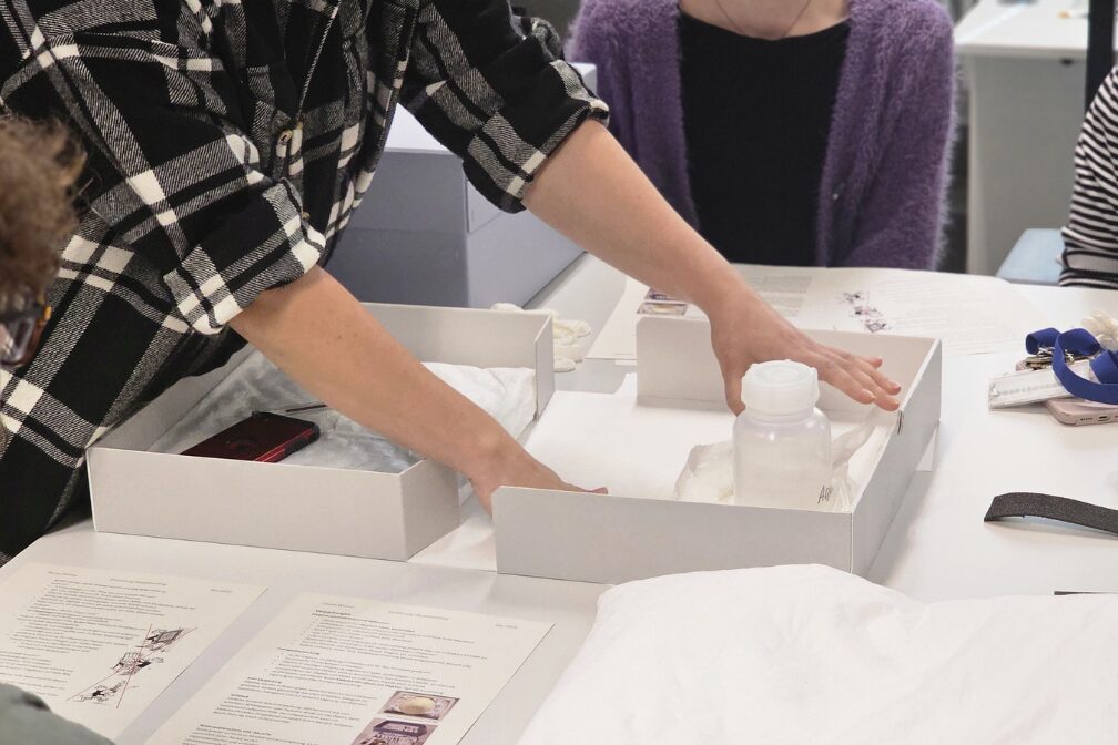 Lisa Hackel zeigt live Arbeitsschritte des „Untersuchens und Reinigens von Objekten“.